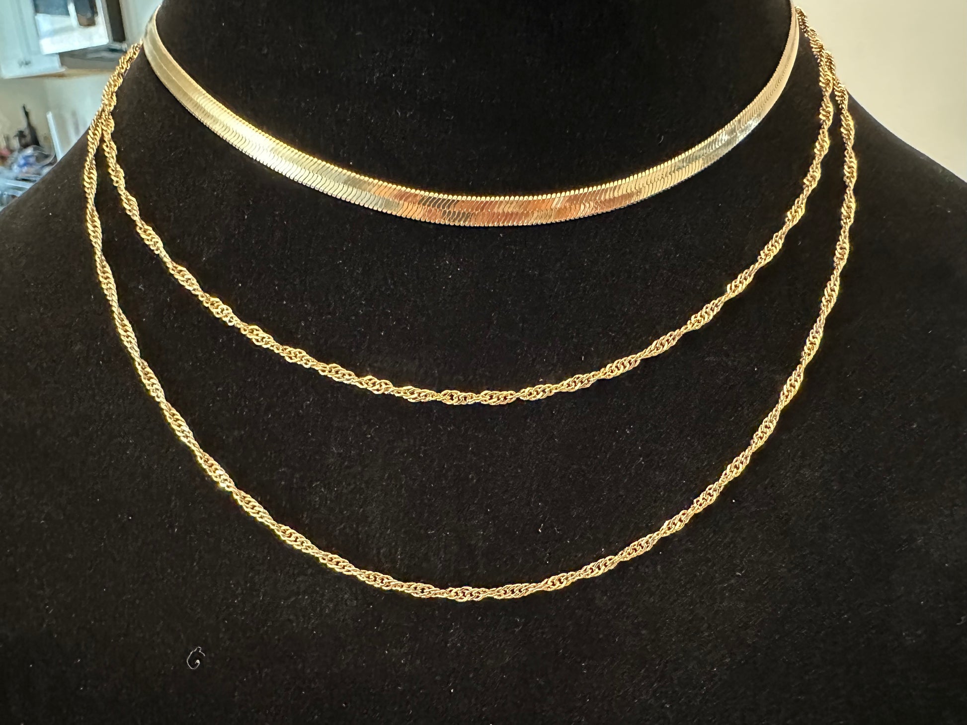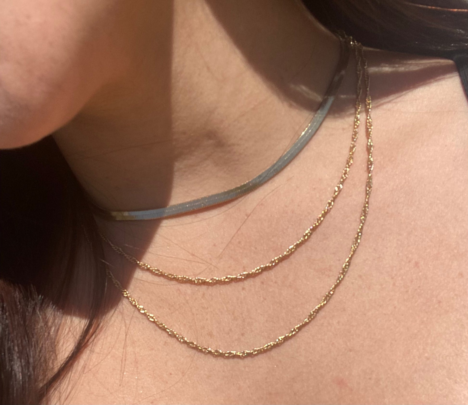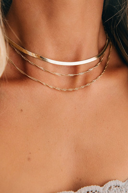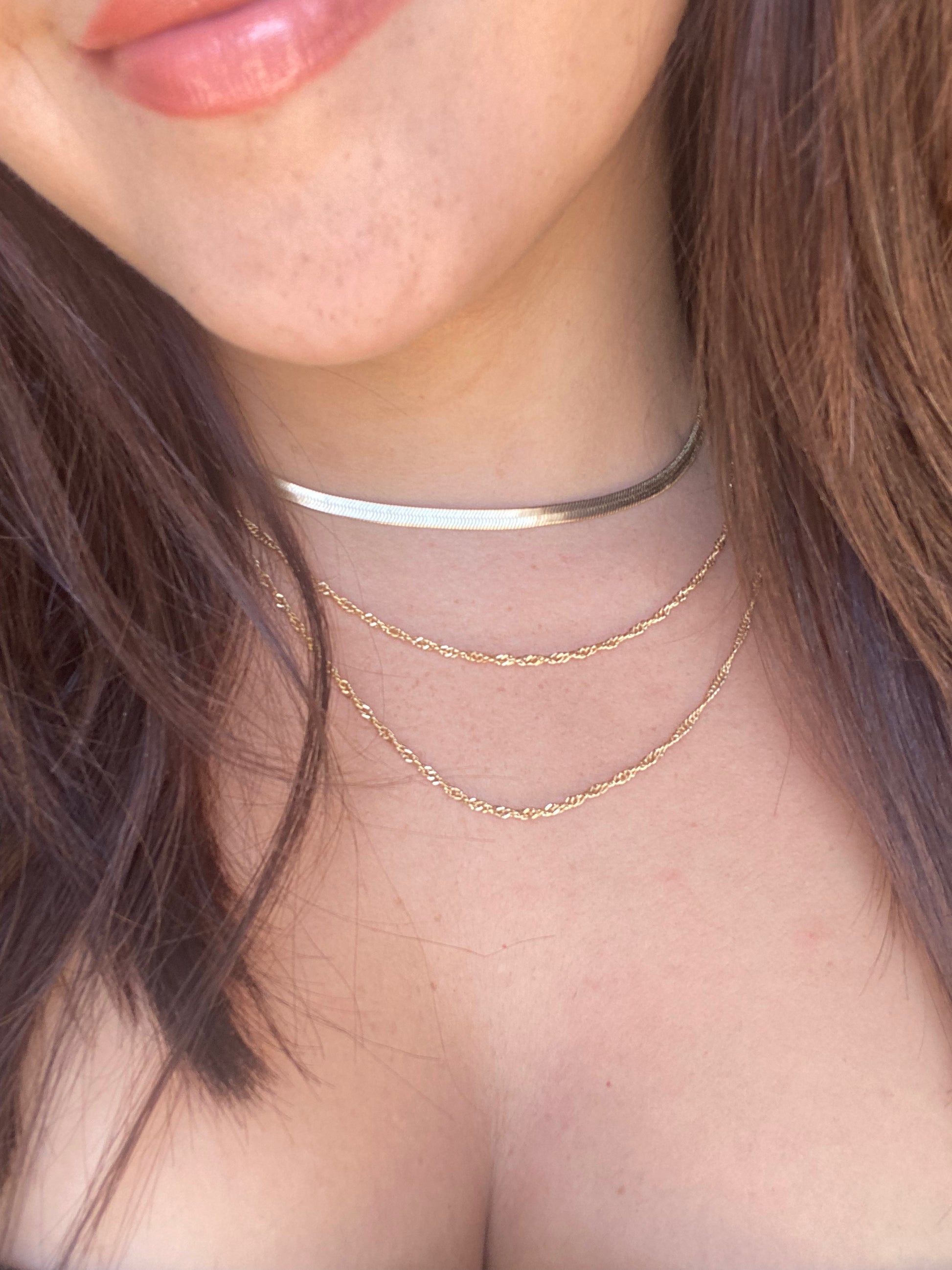 Herringbone Chain is a three-layered chain. It’s all connected into one necklace. This necklace will make your outfit stand out if you’re wearing anything basic or need something to make your outfit pop.