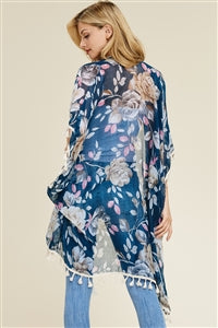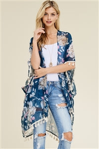 Blue Floral Tassel Kimono is a short sleeve kimono. This kimono a see through kimono, super cute for a beach day! Or it can be worn with a short-sleeve on warmer days. Paired perfect with some light washed jeans.