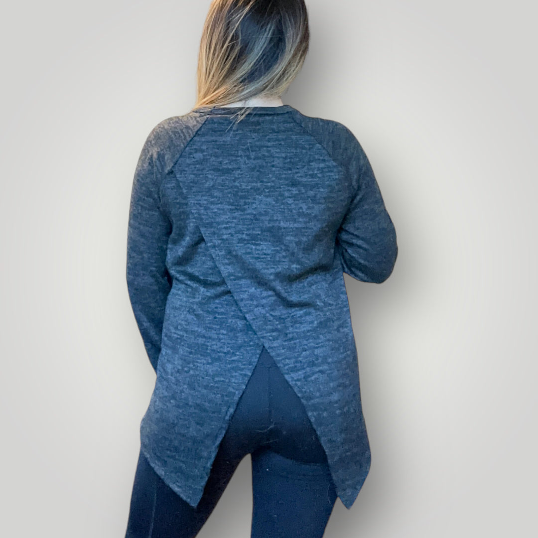 Charcoal Round Neck Sweater is loose fit sweater. This sweater a perfect sweater for a warm night it has an opened back slit to be refreshed.