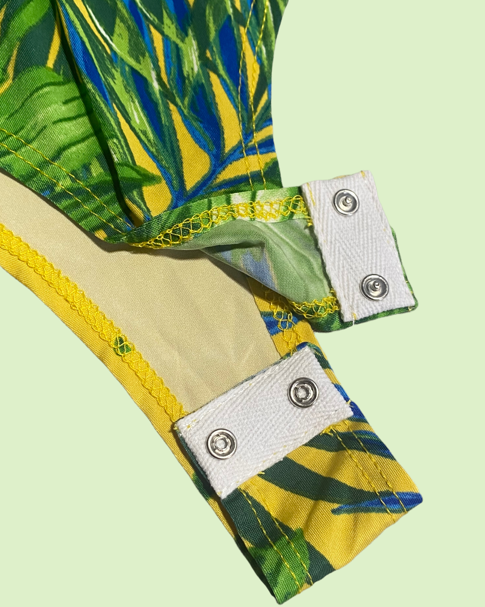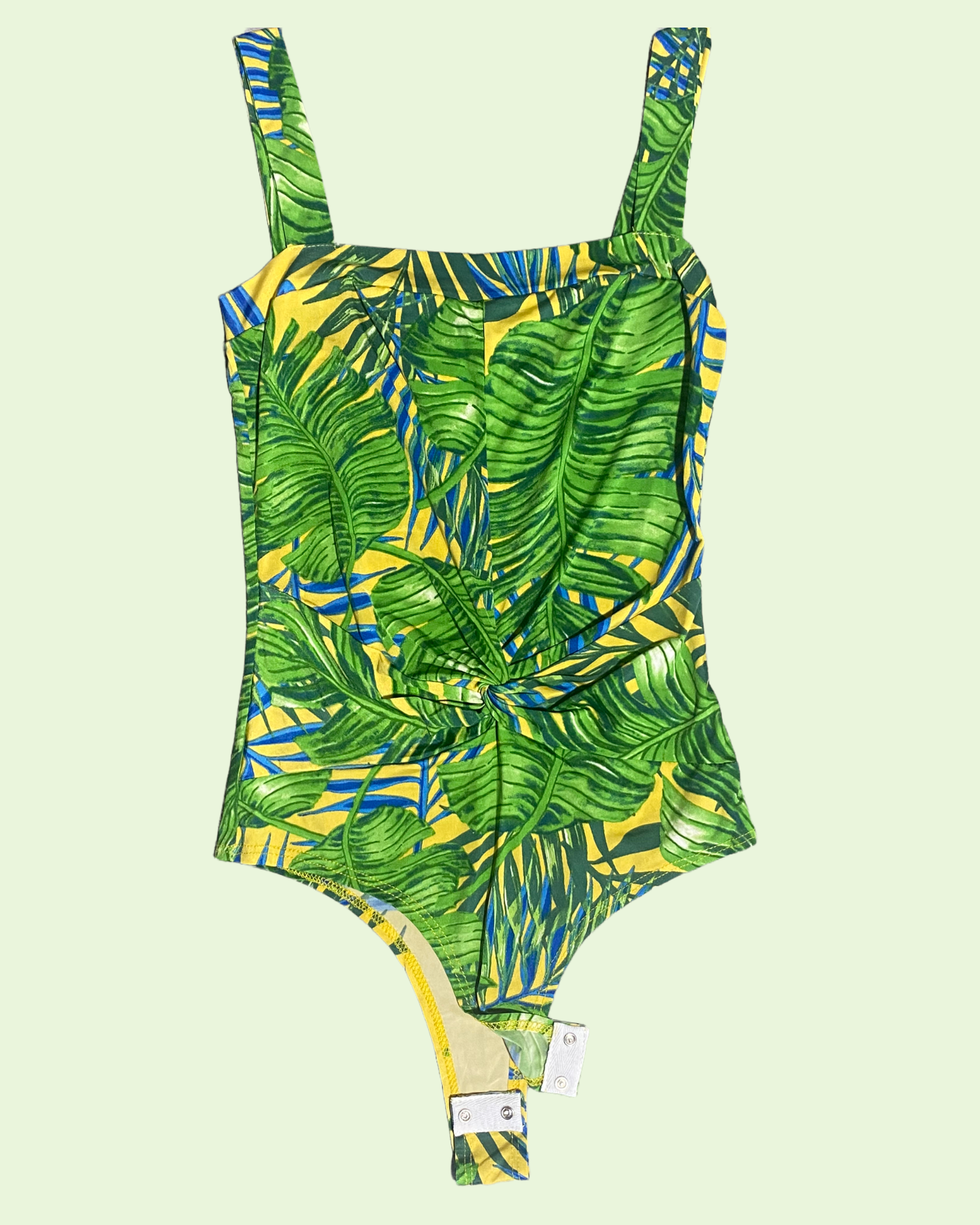 Green Leaver Bodysuit is a fun bodysuit for the summer! If your feeling bright and spontaneous with the colors that you use this one is for you! This cute bodysuit has a squared neck and back with a twist on the stomach part. Perfect with some white pants or shorts